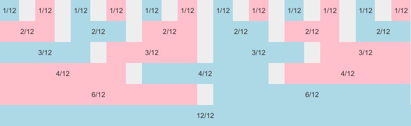 Note that the numbers of all foswikiColxxx elements add up to 12 (6+3+3=12, 4+4+4=12). You may divide a row by any possible decomposition of 12.