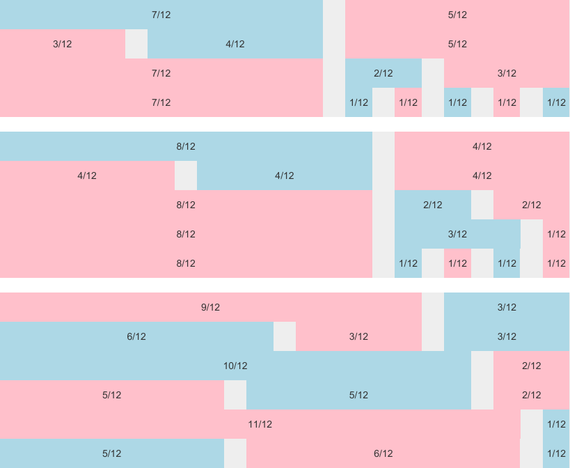 Note that the numbers of all foswikiColxxx elements add up to 12 (6+3+3=12, 4+4+4=12). You may divide a row by any possible decomposition of 12.